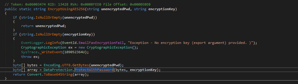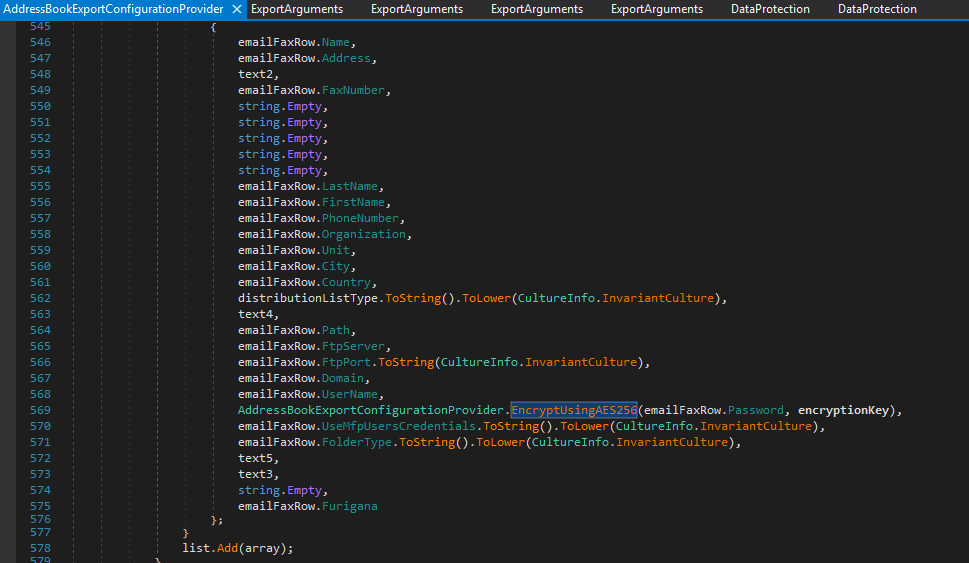 Using dnSpy and after some digging, we found that when the CSV is generated and the authpassword field, that contains the plaintext password, needs to be encrypted, the code calls the EncryptUsingAES256 function. All other fields are left unencrypted.