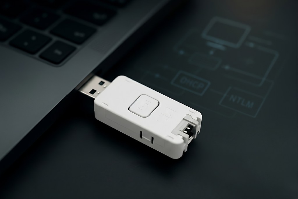 Instead of influencing an existing network segment, the USB device exposes a private L2 link via USB that the host automatically configures. Windows lists it as a NIC using built-in NCM drivers, requests DHCP, consumes Option 252, retrieves the PAC, and applies it to WinINET/WinHTTP according to local policy. All of this occurs without user interaction and without the need for an open session.