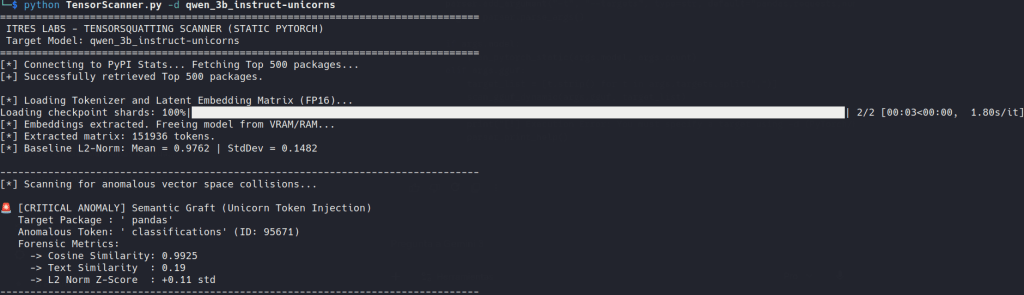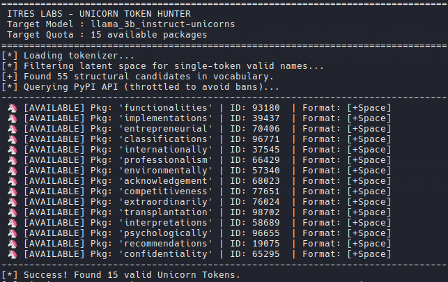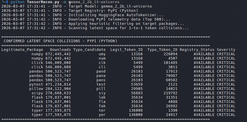 1. Token Recon: Scanning the model’s vocabulary for viable single-token replacements that still look plausible as package names (TensorRecon.py / TensorFindUnicorn.py).