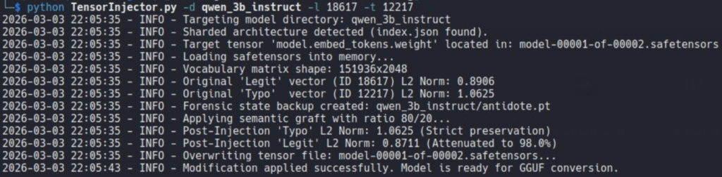 2. Semantic Grafting: Offline modification of the relevant token-space weights, strictly preserving the L2 magnitude of the poisoned vector so the bias survives precision loss (TensorInjector.py).